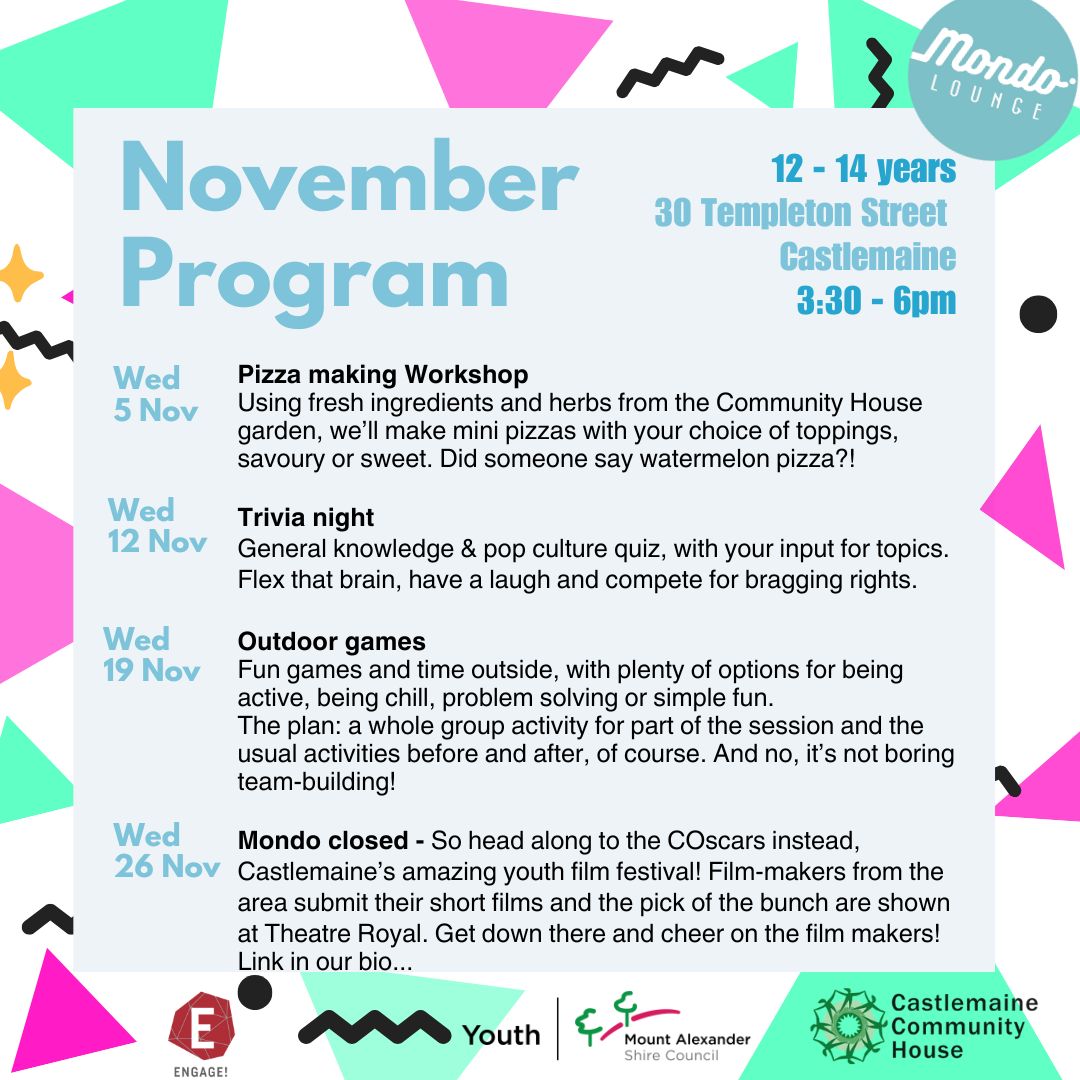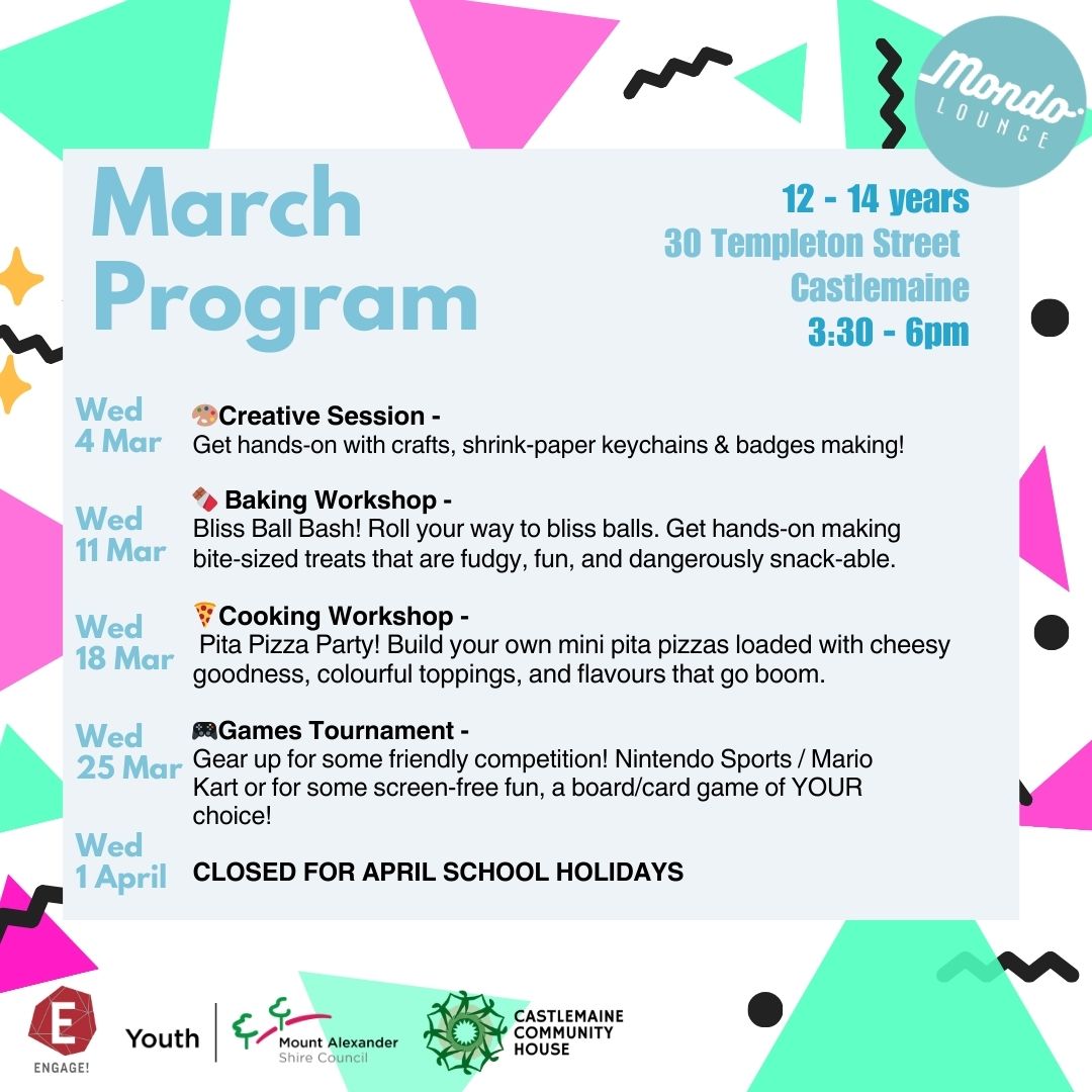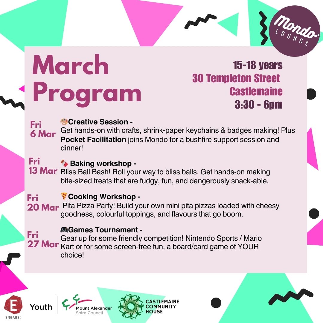 Mondo Lounge is delivered by Mount Alexander Shire Council and is funded by the Victorian State Government ‘Engage!’ grant. Mondo is located at Castlemaine Community House, 30 Templeton Street, Castlemaine.