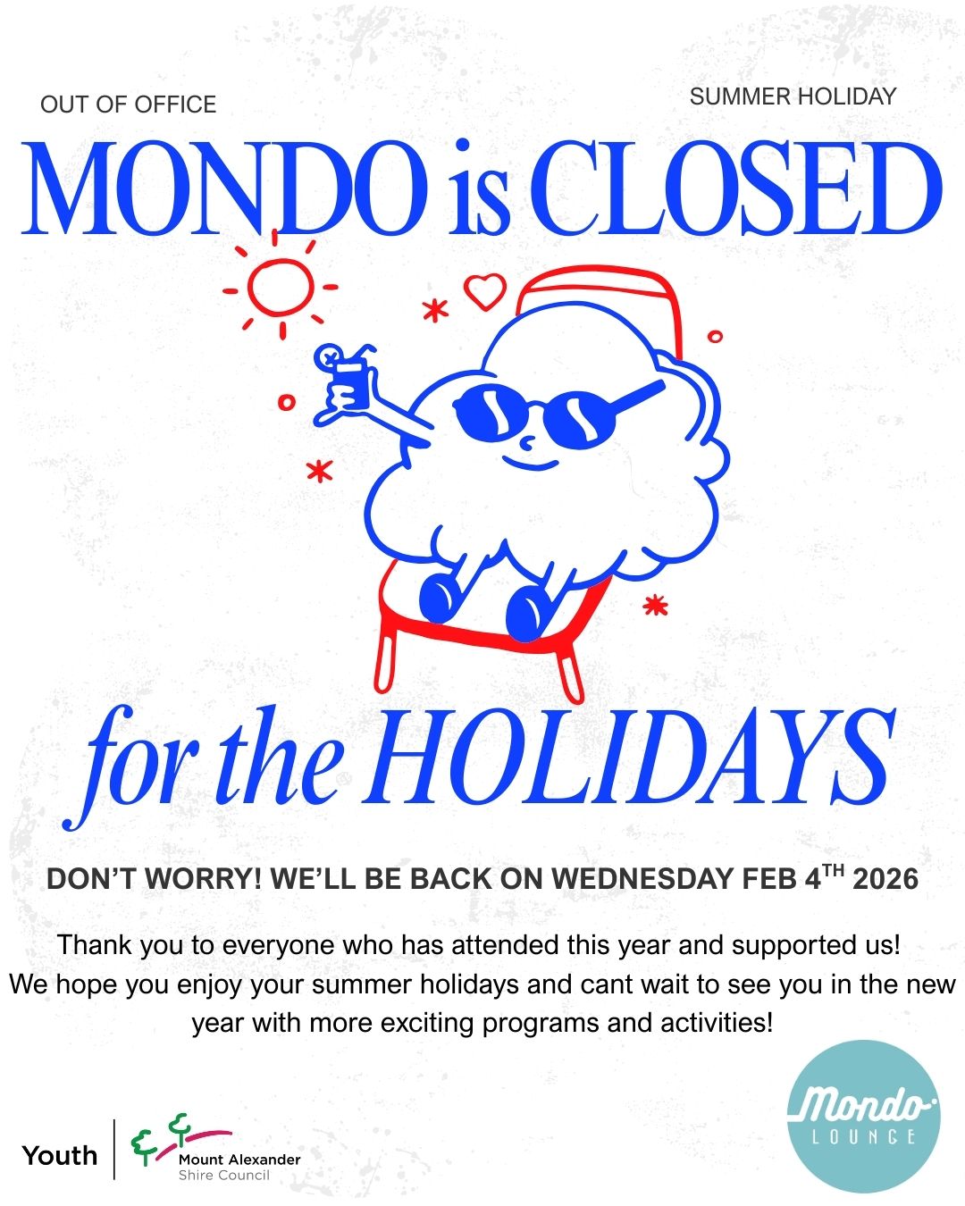 Mondo is closed for the summer holidays and will reopen on Wednesday, 4 February.