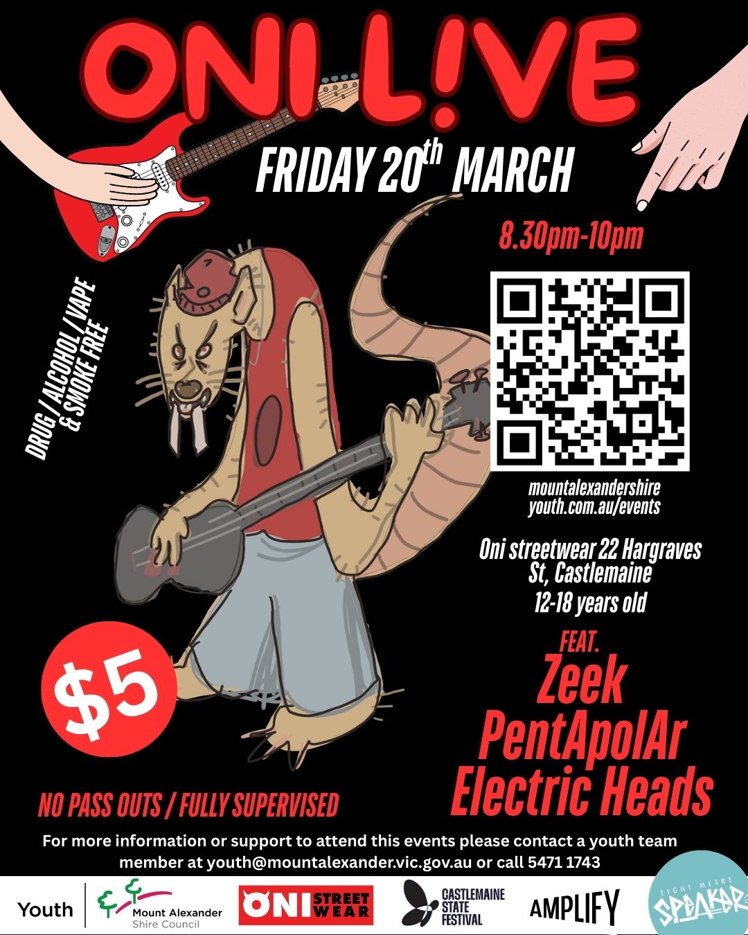 Make your way over to Oni Streetwear on Hargraves street and enjoy a high energy head banging gig to end your night! From 8.30pm-10pm you can see amazingly talented guitarist, Zeek, a (NEW!) punk rock grunge band, @pentapolar and 2025 Battle of the Bands winners and crowd favourites, @electric heads!