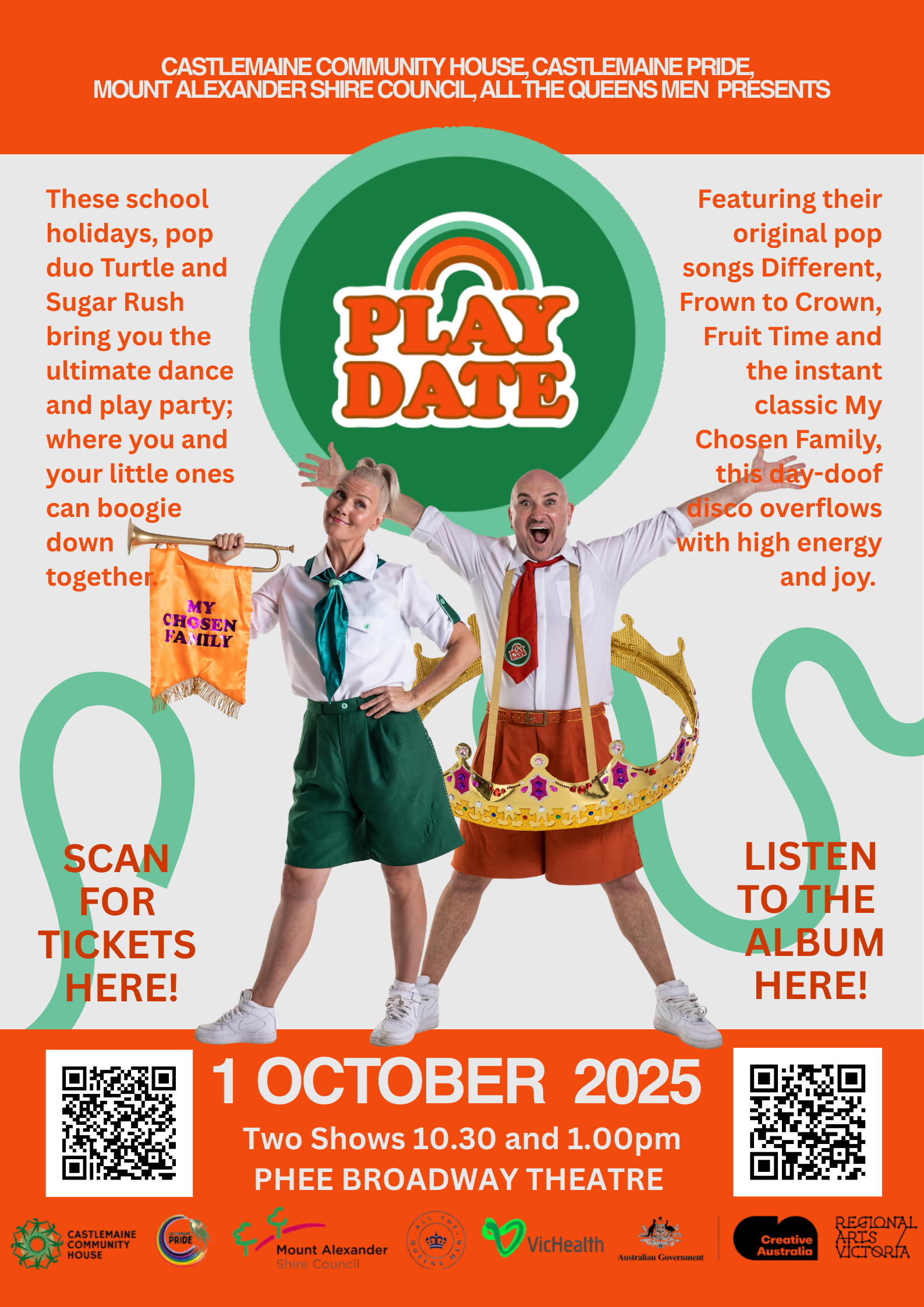 Castlemaine Community House, Castlemaine Pride, and Mount Alexander Shire Council have teamed up with All The Queens Men to bring the fabulous Play Date to town—just in time for the school holidays!